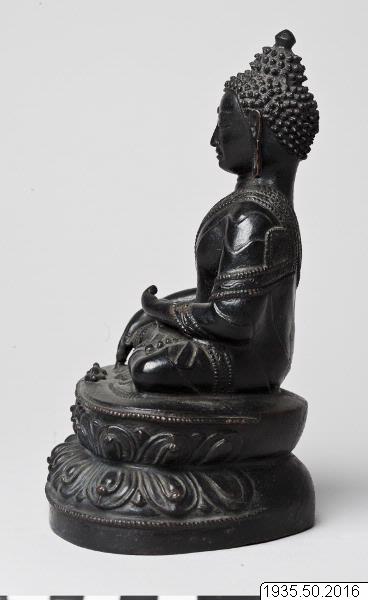 āsana: Han är avbildad sittande i meditationsställning (dhyanasana) på en lotustron. Lotusbladen löper ej runt på baksidan av tronen.
