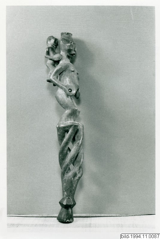 Ett skaft av trä till en flugviska. Övre delen består av en skulptur föreställande en kvinnofigur med ett barn på ryggen. Denna s k kitafigur användes i kitariten och det är denna figur som kitan rådfrågar. Uppgifterna är enligt listan till samlingen från Pastor Ngoubeli i Zanaga 1989. Enligt uppgifter till1993.15.9, som är en bastkjol som användes i samma kult, är kitakulten främst en tekekult men förekommer också bland bembe. Figuren inkom inte med samlingen utan tillhör Einebrandt.Stäng