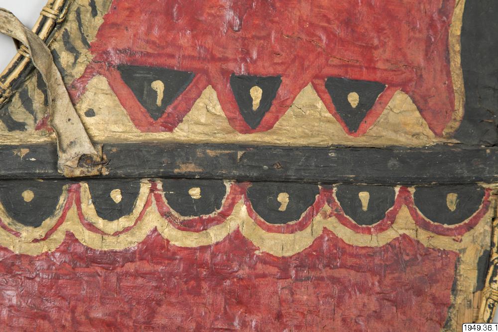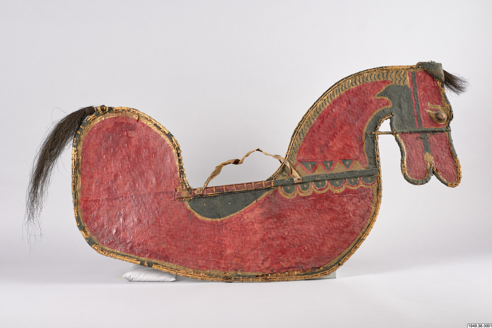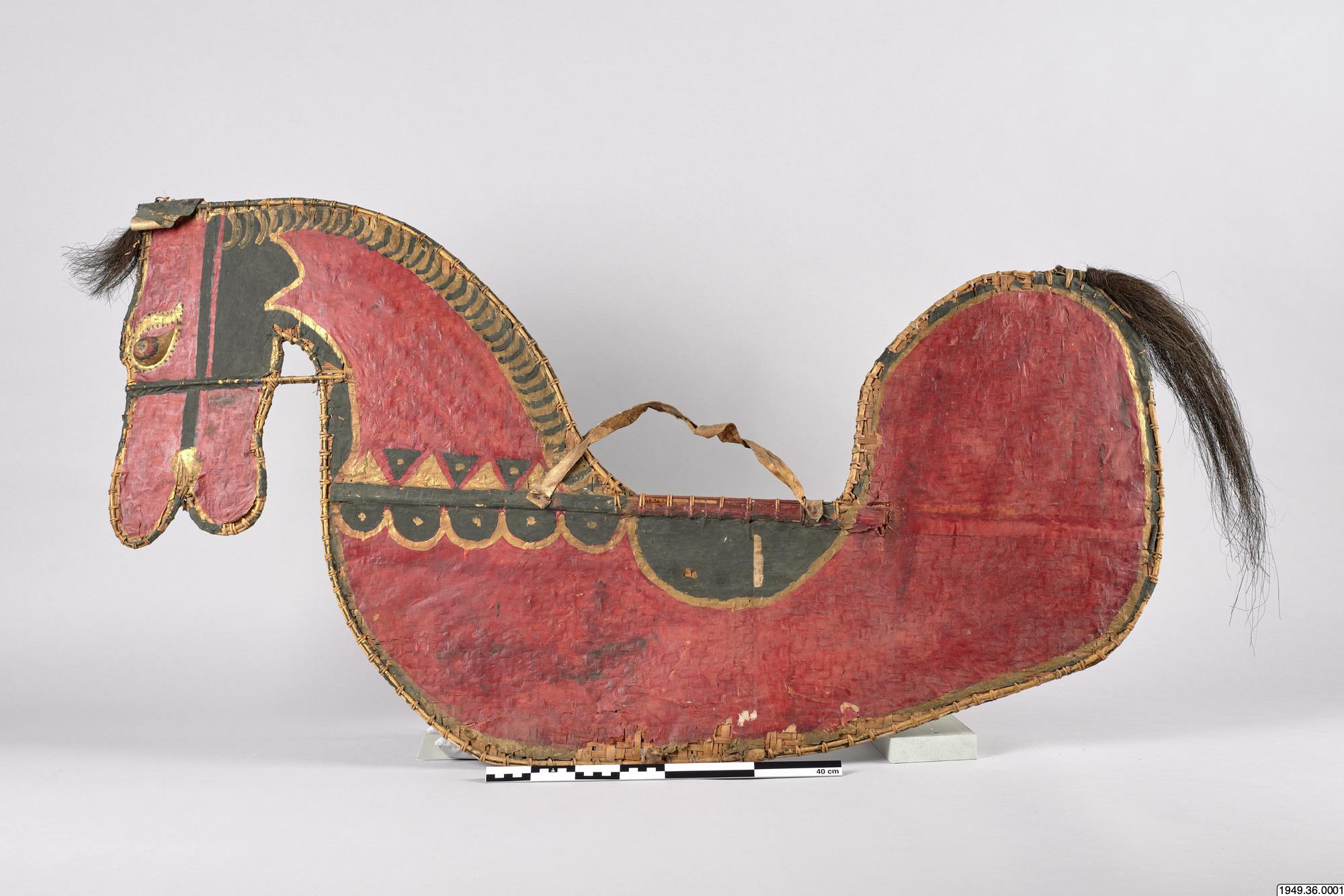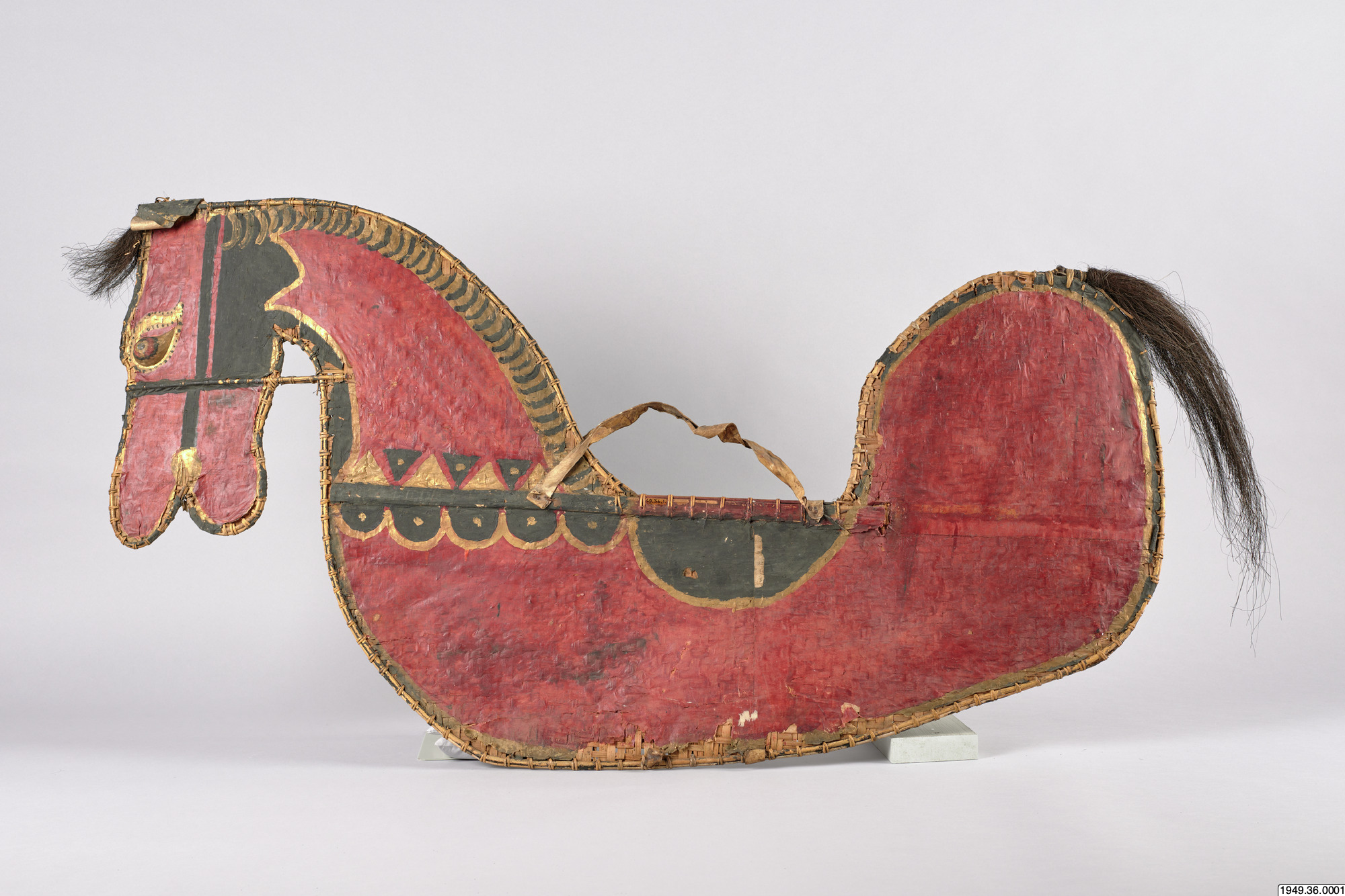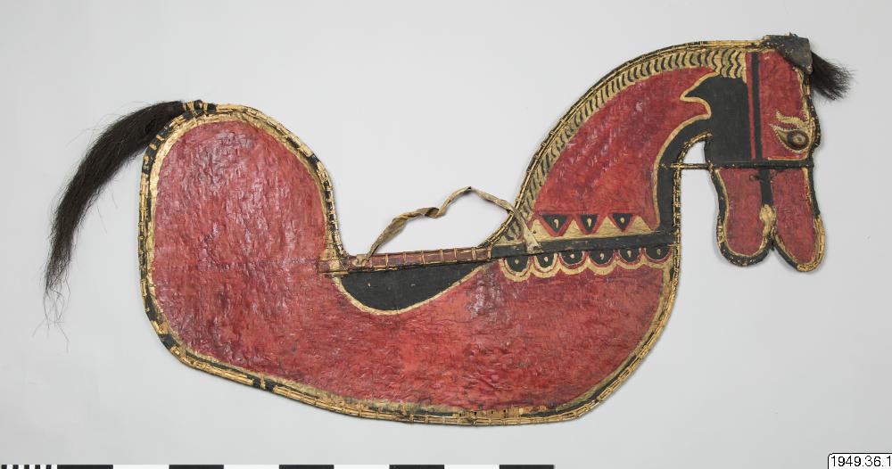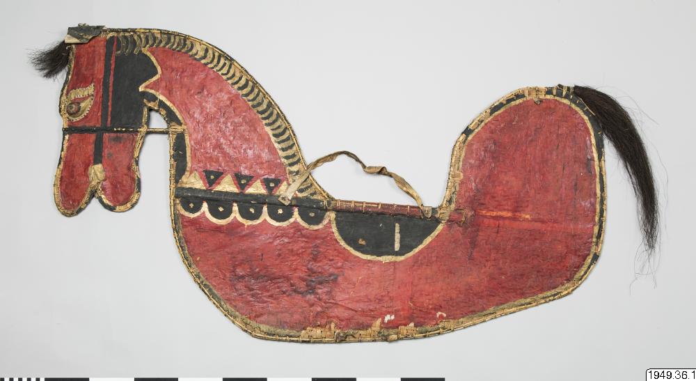 • Häst av flätad bambu med svans och lugg av tagel, ögon av trä och handtag av skinn. Hästen är täckt av tunn papp som målats. Färgen flagnar på hästens ena sida. Hästen är bemålad på samma sätt på båda sidor.
