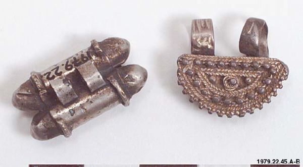 A) Föreställer kyrkans bokrullar i miniatyr, medan B) är ett halvmåneformat smycket (jfr. 1979.22.65). (HTB)