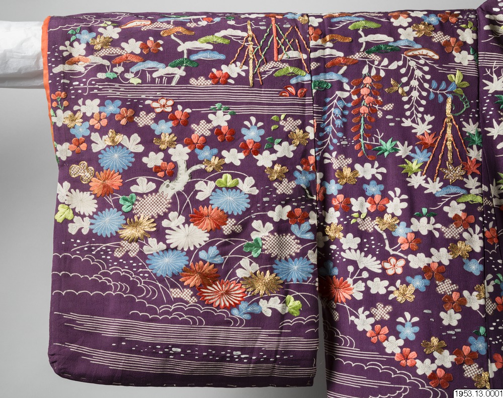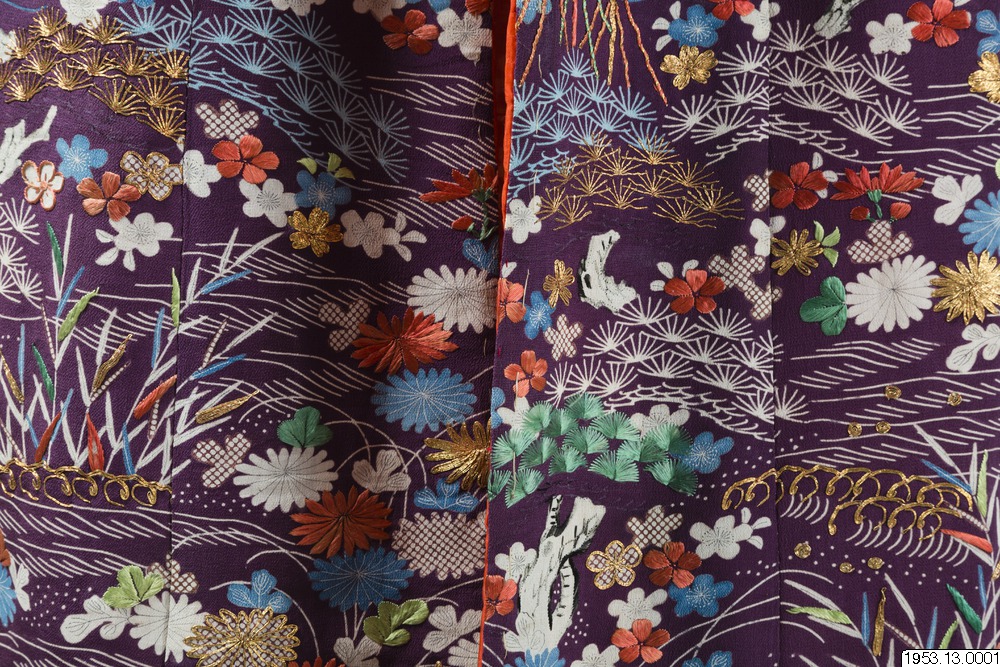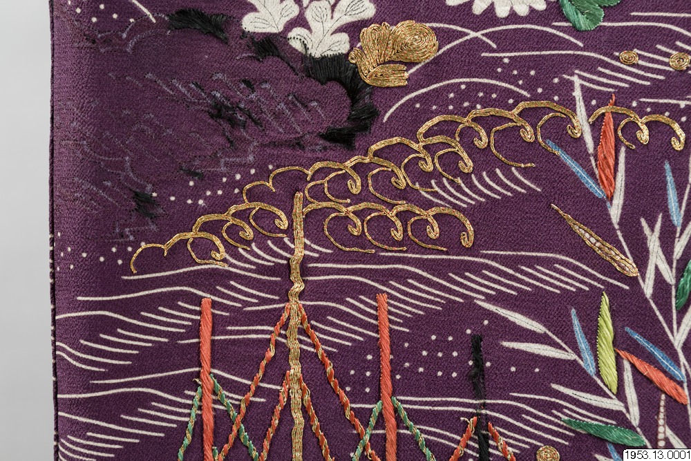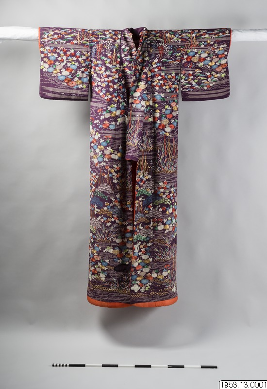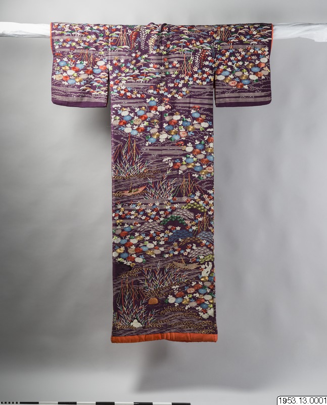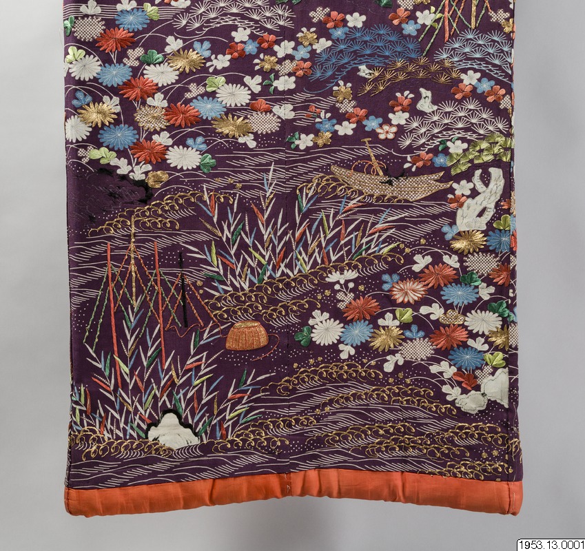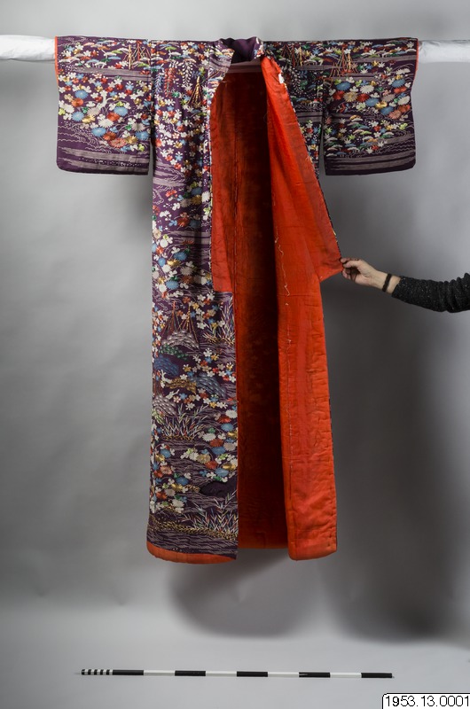 Enligt uppgifter i generalkatalogen: "För en hovdam eller skådespelerska" samt enligt arkivuppgifter daterad till Genroku-perioden (historisk era men konsthistoriskt mer flytande benämning på tiden från ett par decennier i slutet av 1600-talet till ett par decennier i början av 1700-talet). Främst bröllopskimono brukar vara vadderade på detta sätt. Enligt min uppfattning är dateringen alltför tidig, sannolik datering 1800-tal. (PH)