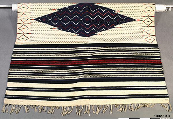 Oaxacadalens sarapes är mycket olika såväl i dekoration som i teknik och storlek. Gamla mönster och äkta färger är sällsynta och har till största delen utträngts av modernare av europeisk "konst" inspirerade dekorationsmotiv. Bottenfärgen i föreliggande fall är vit. Mönstret utgörs av en stor tvärställd central blå rutfigur dekorerad med små vita, röda och gulröda figurer. Huvudmönstringen består ...