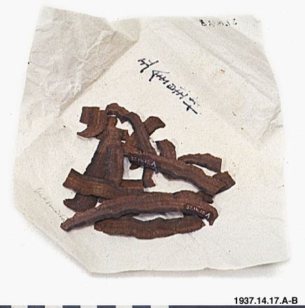 Skivor av rot. A-B. Bruna, ytterst tunna skivor av någon hård rot. De har ursprungligen varit överdragna med antimonglans. Kin Seng Poh. Användes mot buksmärtor.