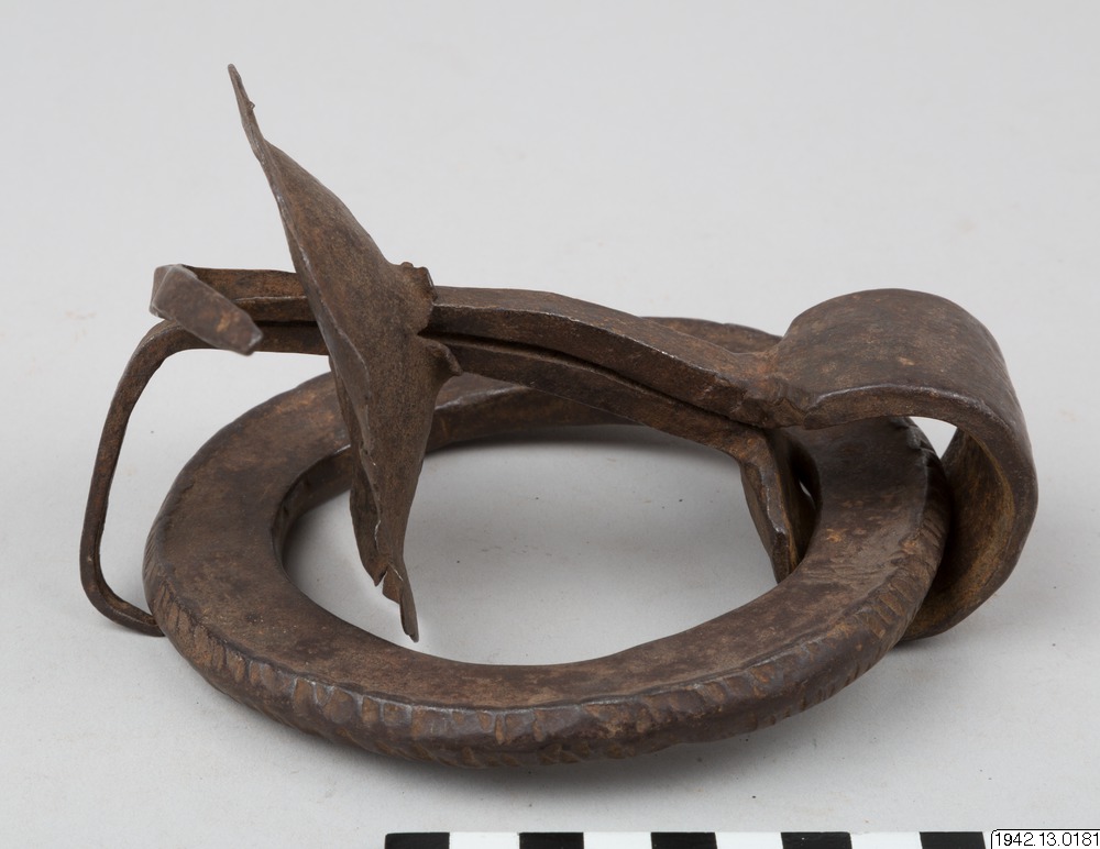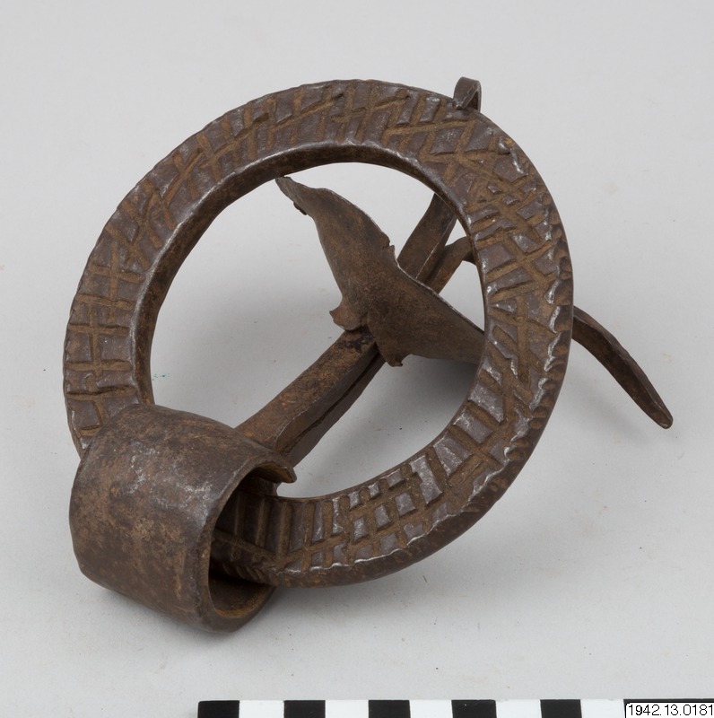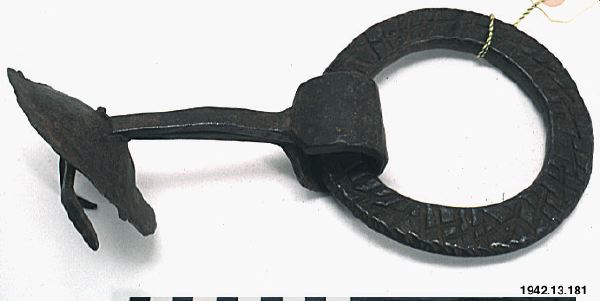 • Ring med grovt linjedekorerad yttersida med fastgörningsögla med kupigt runt plåtbeslag. Max. längd 25 cm. Klappringens diam. 13 cm. [ocr]