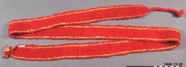 • Faja, av rött ullgarn med två gula längsgående ränder