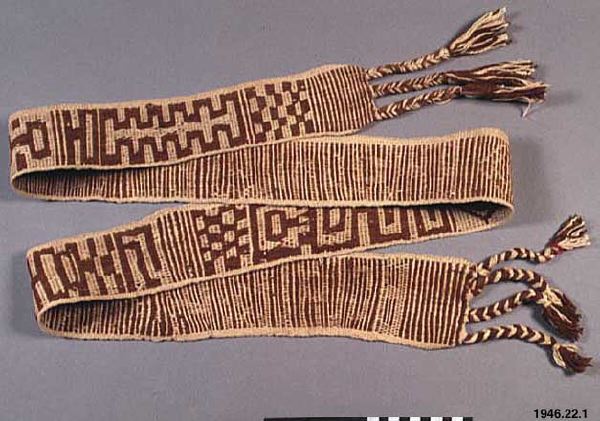 Bälte. Vävt av ull. I' brunt och naturfärgad' vit ull. Längd: 2 m. Bredch 8 cm. Se bildarkivet, Inv• 46.22.1. Lengua-indianer ParaRuayanska Chaeo-området. Katalogen upprättad av fil. dr. S Rydén. [ocr]
