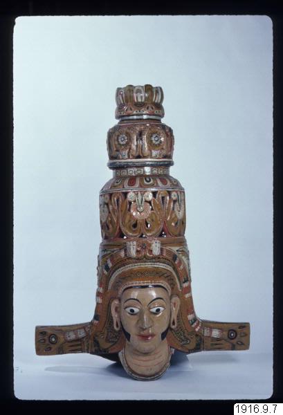 The mask is sculpted in the round. The tiers of the crown are joined together in the shape of a relic dome, a dagoba (Sin.).