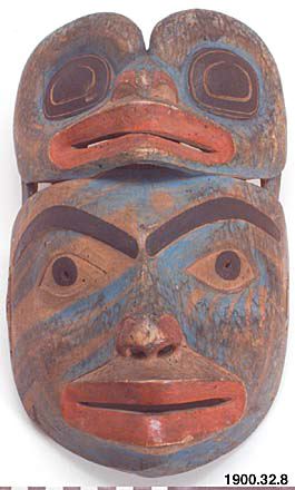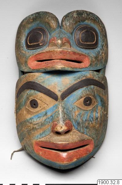 Face mask. Tlingit. The asymmetrical pattern is placed apparently without regard for the form or features of the face. It is painted in light blue-green, a color commonly seen in tlingit specimens. (Holm 2015:24)