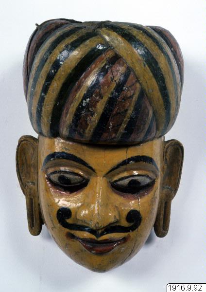 A full turban. The folds are painted in pink, black and yellow lines. The ears are elongated with suspending ear-ornaments. The round face is painted in light yellow. The nose is flat. The eyebrows are drawn in a semi-circle. An imposing cork-screw moustache. The mouth is small and closed, with lips painted in red.