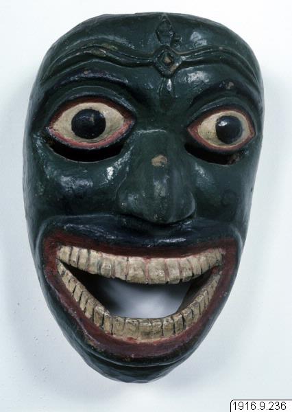 The face is painted dark green. The mouth is wide and half-open. The moustache is delicately painted in black. The eyes squint. The wrinkles on the forehead are combined with a star-like decoration.
