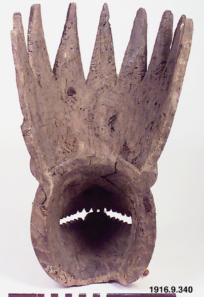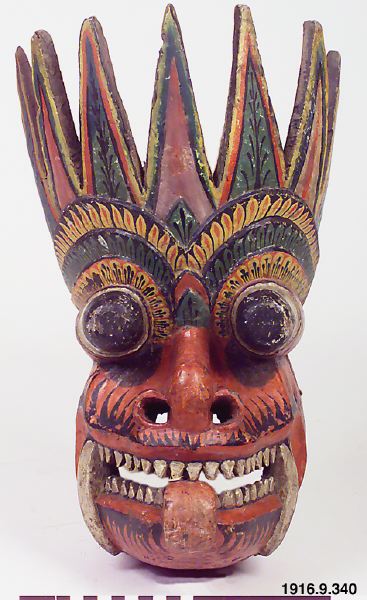 The mouth is in the shape of an animal snout with whiskers painted in black lines. It is elongated and painted in red. The mouth is half-open with broad jaws, two sets of carnivorous teeth, two eye-teeth in the form of tusks, and a lapping tongue. The nostrils are drilled and turned upwards. Protruding eyes. The headdress is composed of six tall spires, which symbolise fire or flames. The eyebrows are shaped in three tiers decorated with petal motifs, pala peti (Sin.), in red, yellow, green and black. The ears are missing.