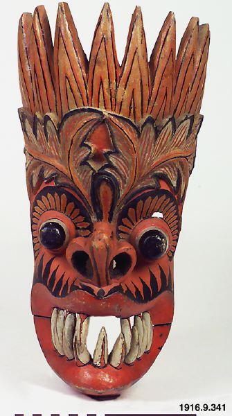• Gapet rött, besatt med, svarta hårtofsar. Underkäken rörlig (ledad). Tänder 4 cm'. långa. ögonlock svarta. ögonhår gula.och röda. Pannan täcks av två bladornament. Uddarna i kronan gula. öronskivor saknas. Höjd:. 48 cm. Bredd: 23 cm. [ocr]