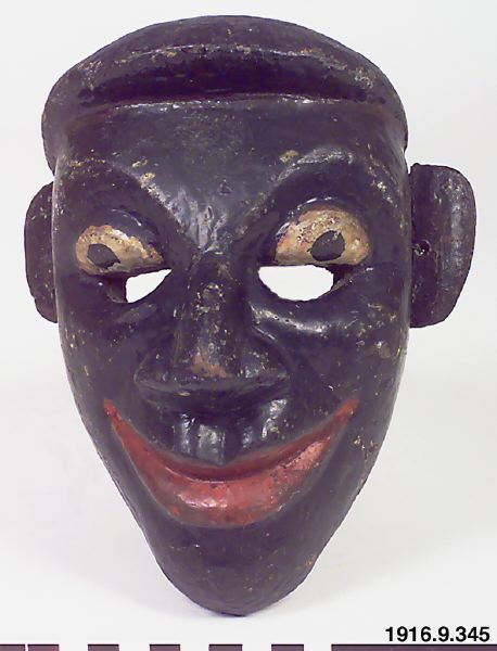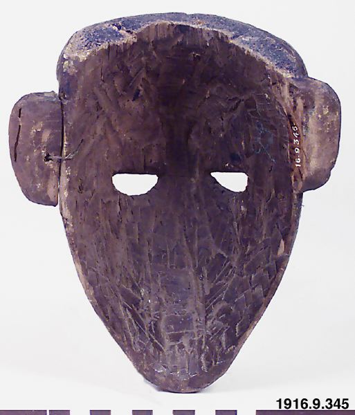 (Svart?). Ansikte svartblått. Stor utskjutande näsa med vida näsborrar."Bed bågformad mun. öron högt uppe i pannhöjd. En framskjutand skärmliknande kant antyder huvudbetäc ningen. Höjd: 22 cm. Bredd: 19 cm. [ocr]
