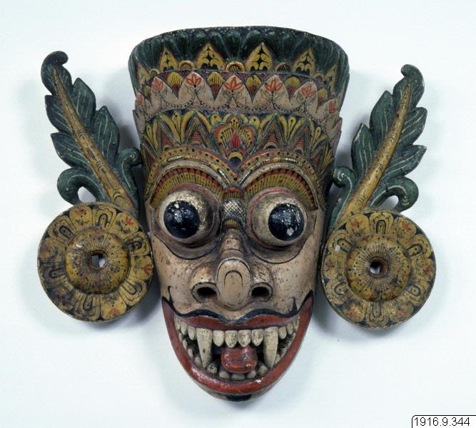 The mask is characteristic of the demon Purnaka. There is a striking resemblance between the mask of the demon of death, maru rassa (Sin.), and the demon Purnaka. But both masks have distinctive styles and attributes, which allow for identification. For instance, the face in this mask is painted in an ash colour, a colour that plays down the ferocity of the demon. The face of maru rassa is normally painted in cherry red.