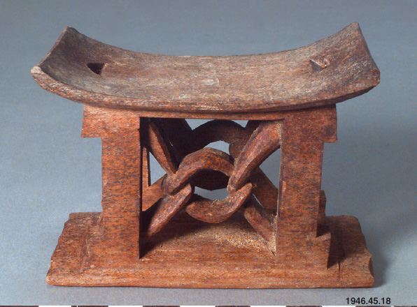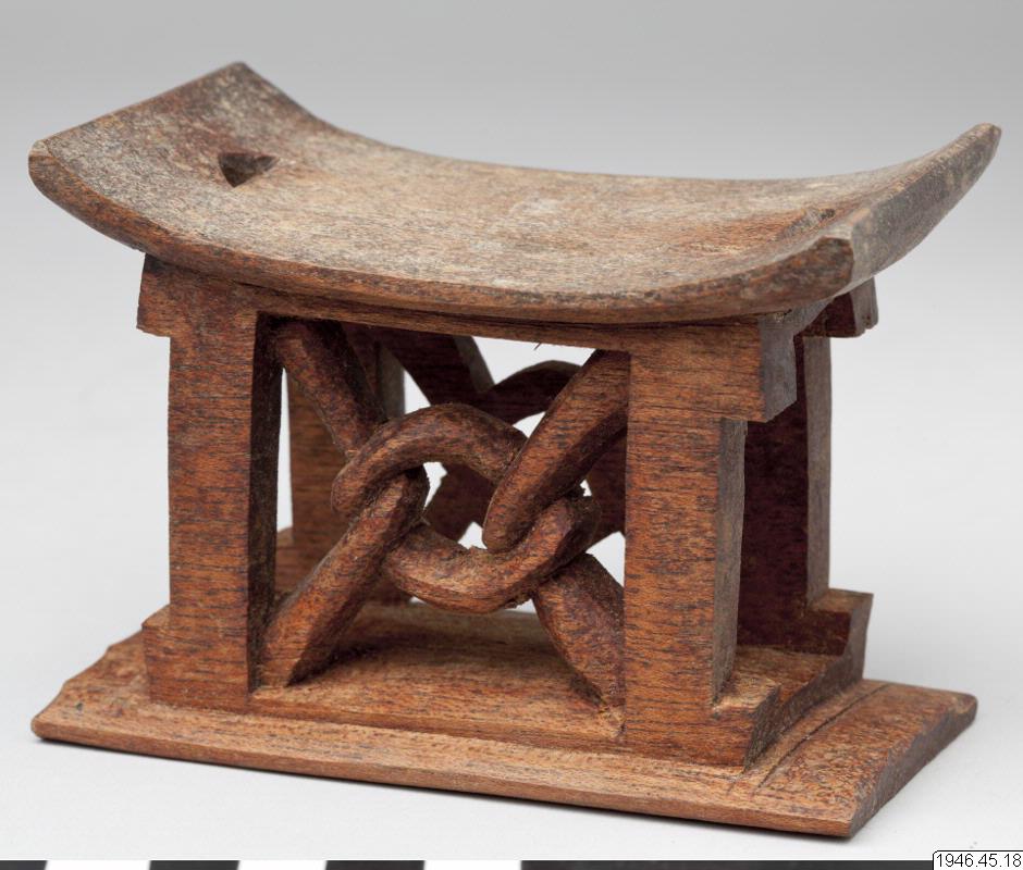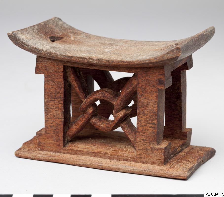 Miniatyrmodell av pall som används vid sammankomster i det högre samhällsskiktet hos ashanti. Varje institution har en särskilt utformad pall. Pallen ingår i en samling pallar (1946.45.10-39) som Jos...