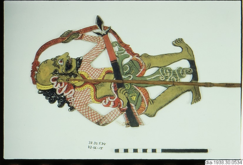 Skuggspelsdocka av ogarvat läder, från ko eller vattenbuffel. Dockan är monterad i en trästav som kluvits ca två tredjedelar av sin längd, den okluvna delen av staven fungerar som handtag. Dockan har inga rörliga delar.