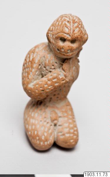 2, 24, 57, 58, 69, 73, 87, 89: Function: The function of these small enigmatic terra-cotta figures is not ascertained. They are archaeological in nature and no written or other documentation seem to have survived as to their role. Normal suggestions that they are toys can be ruled out, at least for the ones which show monkeys engaged in explicit sexual games, but perhaps not for the small figures depicting camels and other animals. There are also small figures which play instruments. The next suggestion is normally then that they have some kind of ritual use, which is however not ascertained. The interesting thing is that they have only been found in Khotan in the South-western corner of the Taklimakan desert, Xinjiang, China. Then associated to archaeological layers from the period from the 1st to 10th century AD when Khotan (or then Yotkan/Bhorasan) was an early and important, even flourishing, entry point for Buddhism from India. In many respects they are directly related to Kashmir (Gandhara) south of Karakorum. Monkeys are not found in Xinjiang and there are many ornamental traits in these small figures which have their direct correspondence in Gandharan art. Acquisition They were acquired in 1895 by Sven Hedin during his first expedition (1893-97). He visited Yotkan, but the acquisitions were made from local peddlers in the bazaar. Every year the Spring-floods exposed objects of this kind from the archaeological layers of what had once been Yotkan. Why this is a masterpiece These kinds of objects, which are found in a small number of museums in the world, have aroused a lot of attention because of their enigmatic nature, their naive but at the same time, explicit character, and because they point to the fact that cultural transfers from India to China did not only contain Buddhist texts and Gandharan art but also elements of what might be “folk-culture”. History of the Object The early history of these objects, before they were covered by sediments later to be exposed by Spring floods is not known. Sven Hedin acquired them in 1895 and donated the collection the Museum of Ethnography in 1903. (Virtual Collection of Masterpieces, http://masterpieces.asemus.museum/Default.aspx)