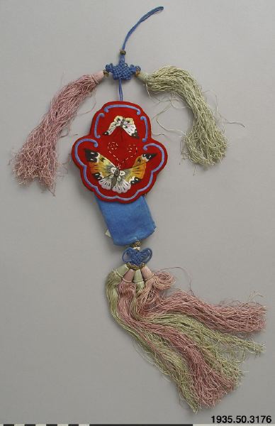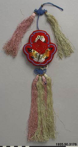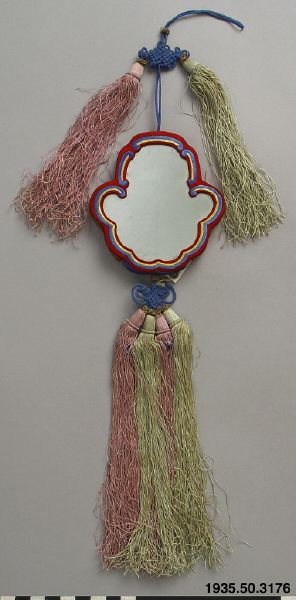 Spegel med sitt fodral av röd sidensatin, med spegeln på ena sidan och silkesbroderade fjärilar på den andra sidan. På kanterna av fodralet broderier i gult och grönt silke. Från en utdragbar tredelad fickförsedd del av turkos sidensatin med lilablå insida utgår en turkos snodd med gulmetalltråd och fyra silkestofsar i rosa och grönt. Från övre delen av fodralet utgår en rosa och en grön tofs. Fodrad med vitt tuskaftat bomullstyg. MLK: "Spegel till kinesisk bruddräkt." (PH) [[Etno]]