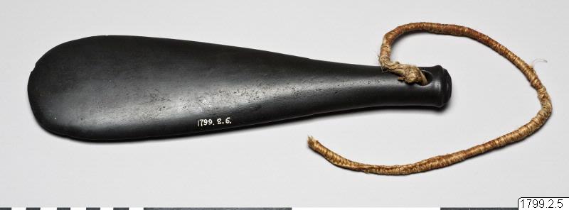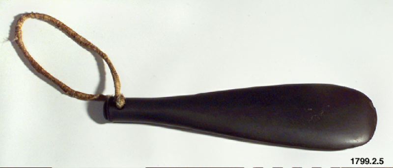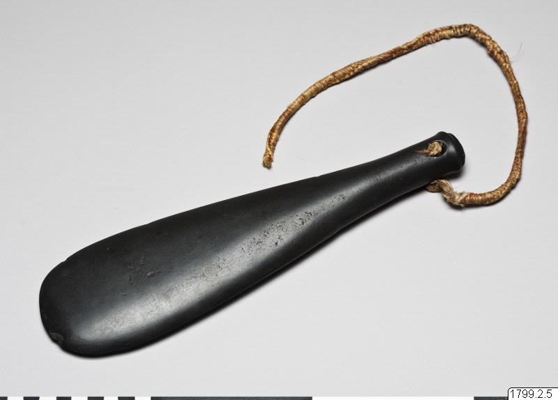 "Kort, platt, tveeggat huggvapen av slipad basalt". Generalkatalogen. Enligt Söderström 1939 sid 49 "Patu" was ... the generic name for all kinds of short war clubs." Se liknande dekor på fästet på huggvapnet i 1848.1.2.