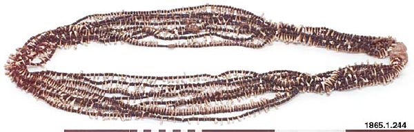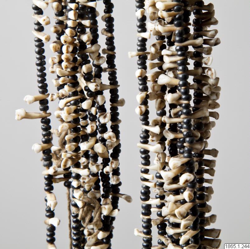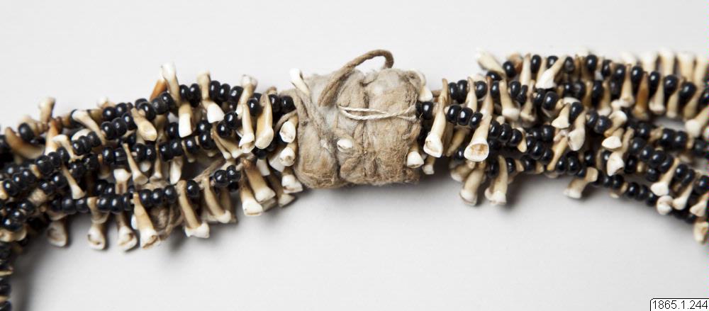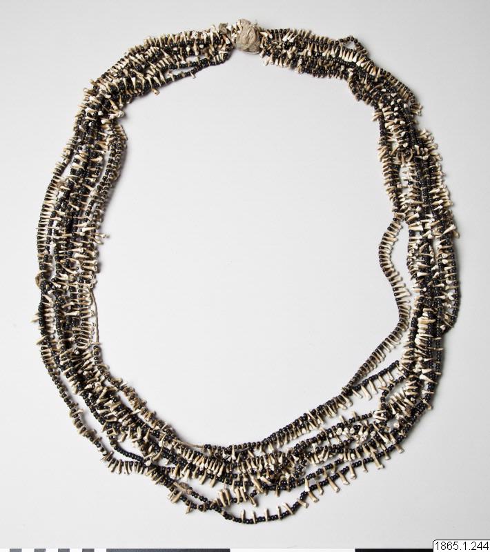 Halsband av aptänder och små svarta frön, 8 radigt. Upptill ombundet med bomullssnöre och även otvinnad bomull.