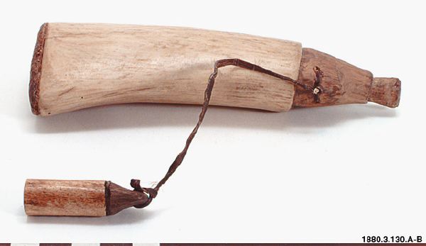 • Kruthorn med krutmått av renhorn och trä. Sammanknutna med en skinnrem.