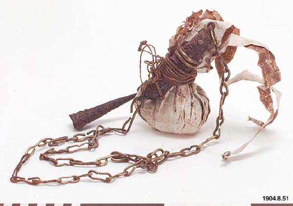 Mässingskedja med vidhängande horn och "påse" av tigerkattskinn (vilken är i mycket torrt tillstånd). I påsen kraftbärande substans. Fasstvirat kring påsen är ett ca 13 cm avlångt föremål, i sin tur invirat i ett djurskinn. I föremålet är en mässinstav placerad och en mässingsring och natursnören omringar föremålet.