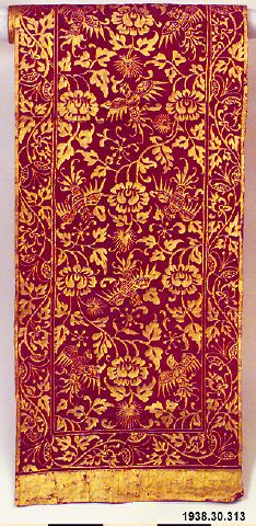 Enligt generalkatalogen: "Duk eller gördel av vinrött siden. På den enfärgade botten har sedan lagts guld i stiliserade mönster med fåglar, blommor och blad. Enligt ing. Kistner har den möjligen använts vid dansen Kebiyar (jfr. Covarrubias)".
