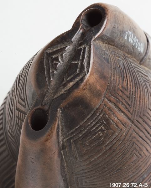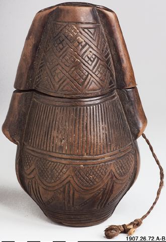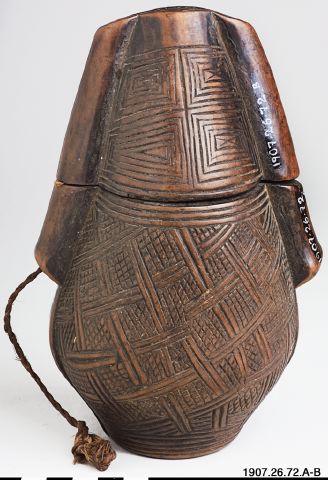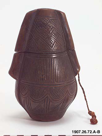 Kruthorn och lock vilka hålls ihop med ett växtfibersnöre. Ena sidans snöre saknas. Hela föremålets yta är täckt av snidat mönster i olika mönsterpartier och mönster, streck, rutor, vågor, cirklar, taggar mm. Mönstringen är väl planerad och samtidigt oregelbunden. Även bottenplattan är dekorerad.
