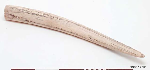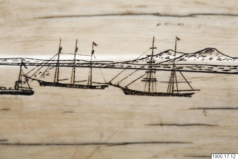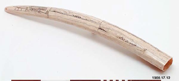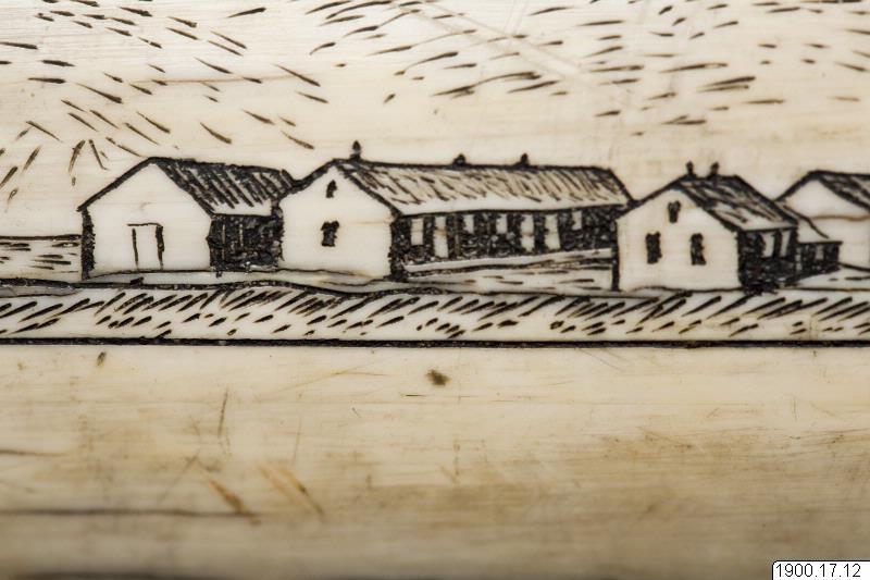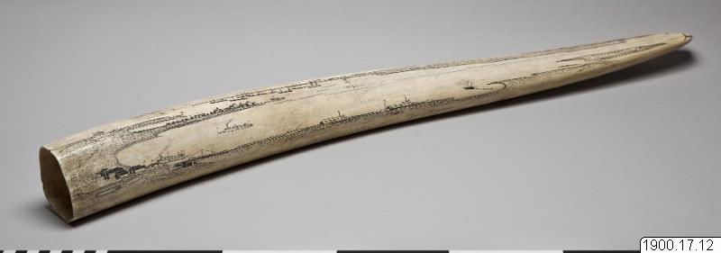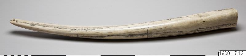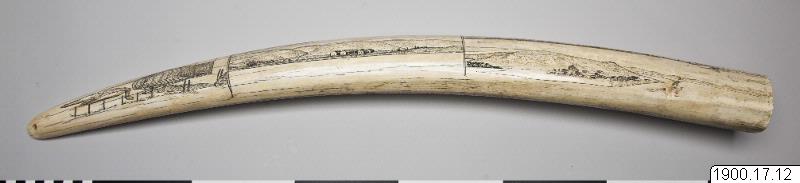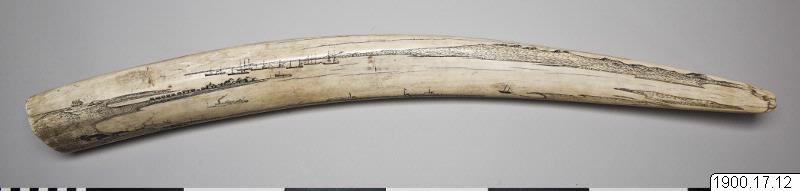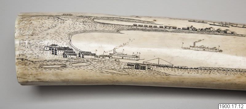 Valrossbete med inristade djur och landskapsbilder, ifyllda med svart färg. På ena sidan en bild av Port St Michaels med en mängd segel- och ångfartyg, samt hus på stranden. På den andra sidan två landskapsbilder samt en stor fiskryssja och tre lakeliknande fiskar. Teckningen röjer stark påverkan av civilisation, möjligen utförd av någon guldgrävare och graverad av den eskimå, som sålde den och ut...