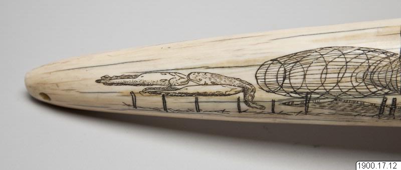 Valrossbete med inristade djur och landskapsbilder, ifyllda med svart färg. På ena sidan en bild av Port St Michaels med en mängd segel- och ångfartyg, samt hus på stranden. På den andra sidan två landskapsbilder samt en stor fiskryssja och tre lakeliknande fiskar. Teckningen röjer stark påverkan av civilisation, möjligen utförd av någon guldgrävare och graverad av den eskimå, som sålde den och utgav sig för att ha utfört den. (generalkatalogen)