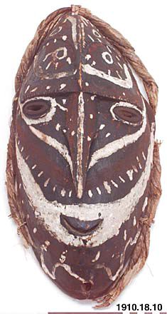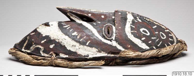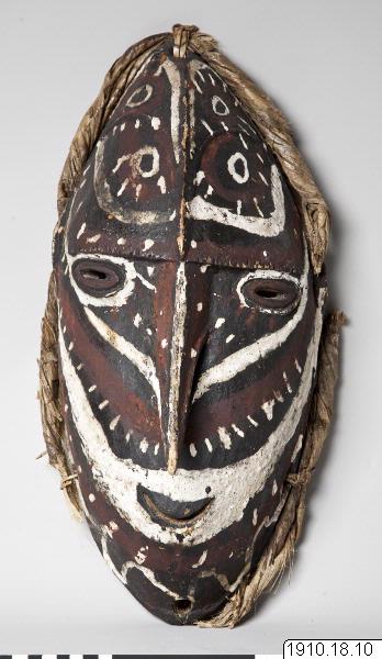 • Dansmask av trä, härstammande från Dallmannhafen i Tyska Nya Guinea. Masken är utförd av trä, onaturligt lång och smal. Näsan är mycket lång, tillspetsad med över överläppen neddragen spets. Pannan försedd med en hög mittås. Masken är målad med ett mycket brett vitt streck, löpande över munnen (lämnar dock själva munnen fri) upp över de skulpturalt skisserade öronen. Ögonen omges av vita ränder, n... Visa hela