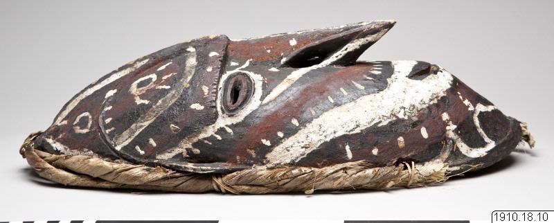 • av trä, härstammande från Dallmannhafen i Tyska Nya Guinea. Masken är utförd av trä, onaturligt lång och smal. Näsan är mycket lång, tillspetsad med över överläppen neddragen spets. Pannan försedd med... Visa hela