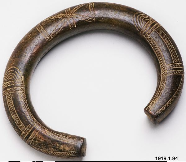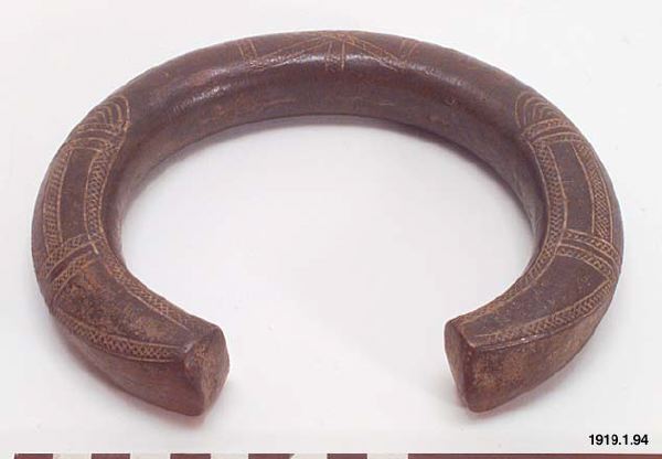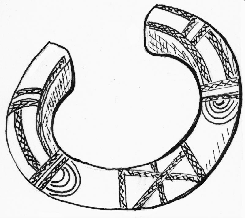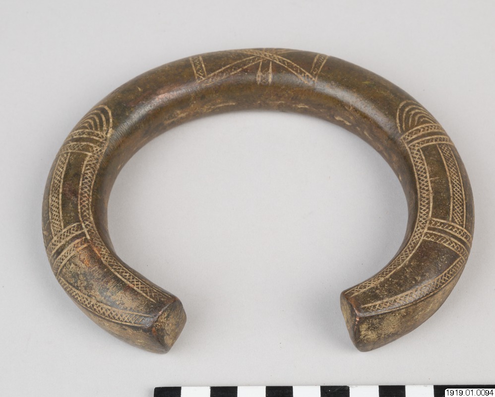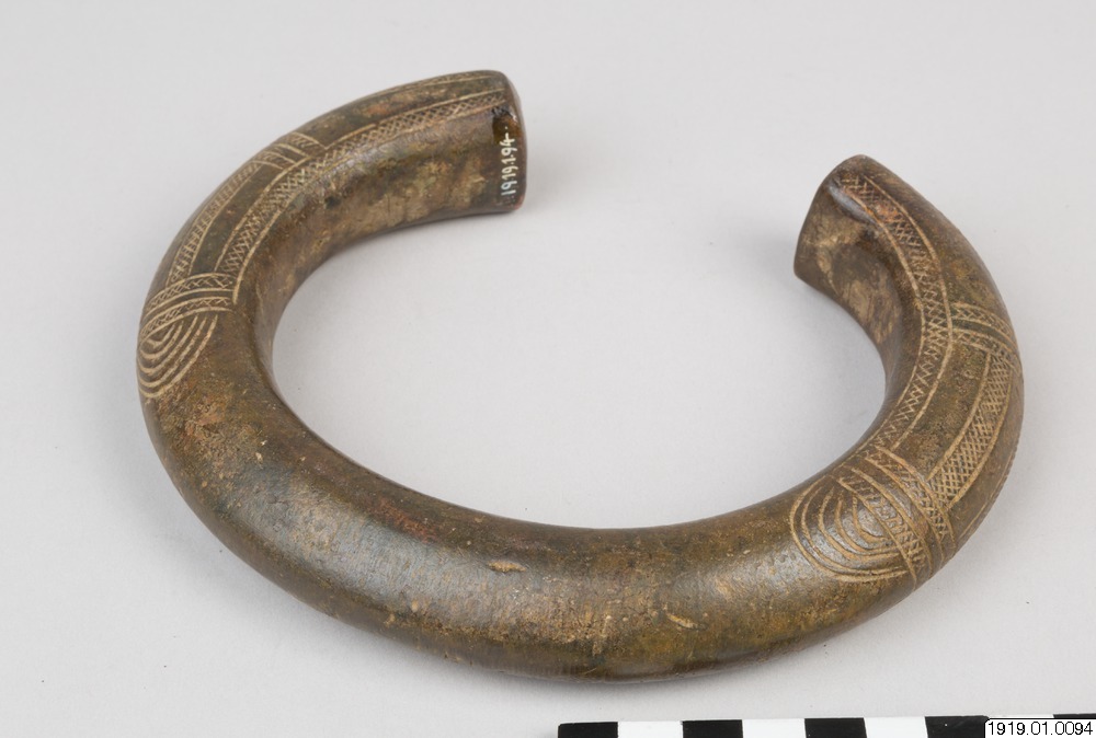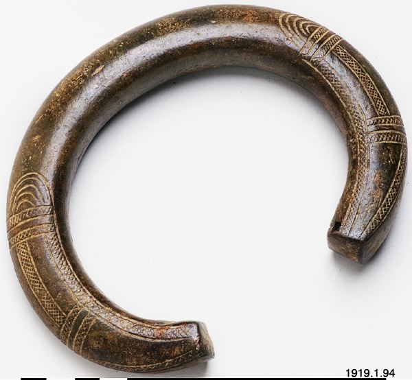 Troligen en ring att ha ring halsen. Ornamenterad kring ändarna mot öppningen och över mitten av ringen. Mestadels linjära mönster med halvcirklar vid ändarna av mönstren. I katalogen står "=5 kr".