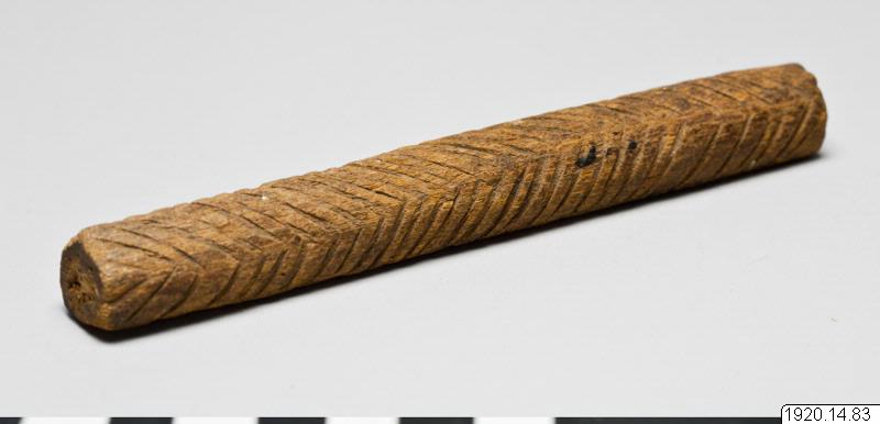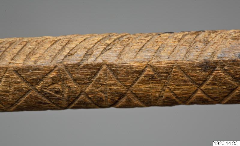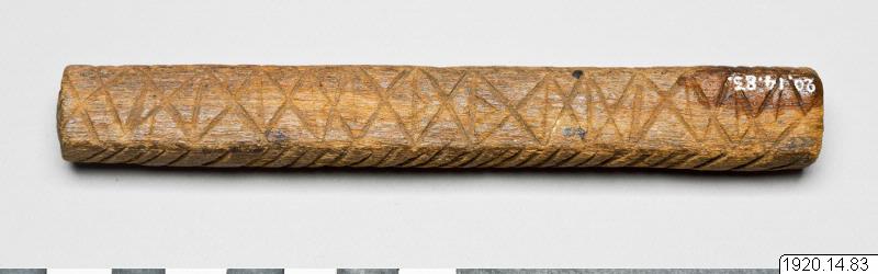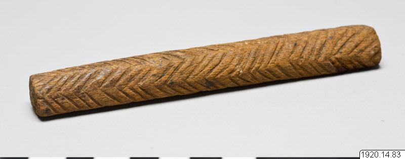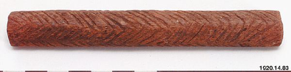 • Brevstav. Större än någon av de två föregående. Plan på ena sidan. I genomskärning, alltså närmast halvcirkelformig. Den plana ytan har grunda ränder. Pinnens övriga långsidor har ett sammanhängande fiskbensmönster, alltså sicksacklinjer på tvären. Längd 13,2 cm,. Största tjocklek 1,7 cm, Queensland Australien