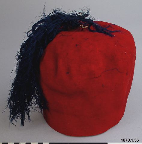 Röd filtmössa med mörkblå silke som tofs. Enligt vidfäst lapp "Turkiet." (PH) [[Etno]]