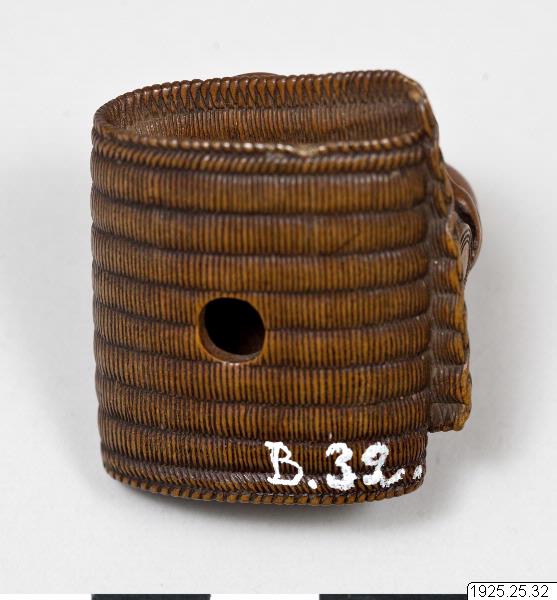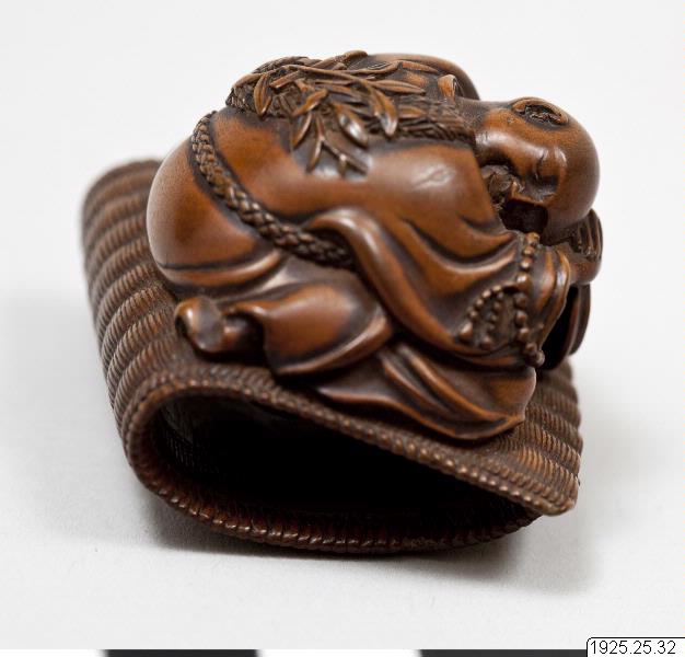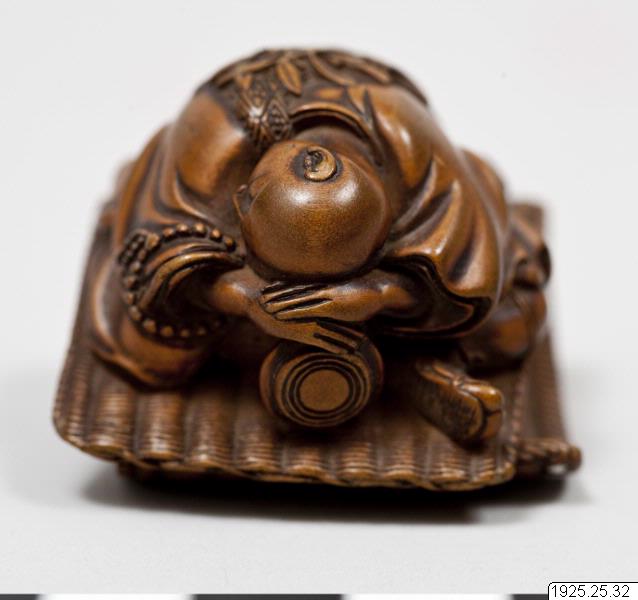 Netsuke av trä. Präst som somnat över sin slagtrumma, sittande på en dubbelvikt bastmatta. (Enligt generalkatalogen). Kimonon har inga fickor, småsaker kunde läggas i ärmarna och innanför bältet och så kunde man bära olika dosor, pipor och penselfodral på en snodd från bältet. De bärbara sakerna kallas sagemono. Accessoarerna blev särskilt för männen identitetsskapande statusföremål och en viktig del av herrmodet, en egen värld i mindre skala med rika motiv. Olika typer av konstnärligt utformade sagemono är kända fr o m 1600-talet. Förutom tobaksrelaterade dosor är en av de mer kända typerna sigilldosor (inro). Bokstavlig betydelse är en korg (ro) att lägga sigill (in) i. Enligt lag var endast stämplade signaturer giltiga vilket krävde att t ex samurajer och köpmän som hade behov av sigillstämplar fick bära dem med sig i små dosor. Detta var ursprunget till sigilldosor (inro) som snart främst kom att användas för medicinförvaring. Utseendet på accessoarerna varierade efter bärarens smak, ekonomi och modetrender. När västerländsk klädsel med fickor blev populär under Meiji-perioden (1868–1912) minskade behovet av dessa bärbara föremål och de delades ibland upp i sina beståndsdelar (netsuke, s k bältesknappar) för sig och såldes till västerlänningar. (Baserad på text från utställningskatalogen Japan. Föremål och bilder berättar. 2011). Miniatyrskulpturerna, ofta kallade bältesknappar, (netsuke) rymmer en hel värld att utforska. Myter är ett stort motiv. Ofta var designen lyckobringande och inte minst underhållande. Netsuke-föremålets funktion består i att vara en motvikt till de "hängande saker" (sagemono) som bars till kimonon av männen. Vanliga hängande saker var olika dosor, till exempel medicindosor (inro) och tobakspungar. Netsuke betyder ungefär "fästa rot" och tidiga netsuke (före sent 1600-tal) var förmodligen naturliga, obearbetade rötter och liknande. Från 1700-talet gjordes de mer föreställande och ofta i trä eller elfenben. Så småningom började konstnärerna att signera sina netsuke. (Baserad på text från utställningen Japan. Föremål och bilder berättar. 2011). /PH