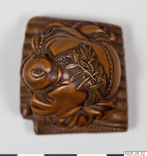 Netsuke of wood depicting a priest who has fallen asleep over his bell on a folded tatami mat. The kimono having no pockets, accessories have to be carried somehow. Women could put small objects in their sleeves and sash, whereas men, mainly, would hang their various boxes, pipes and brush cases on a cord at their belt. The portable objects are called sagemono. Accessories became identity-forming status objects and an important part of men´s fashion, a world in miniature with a wealth of subjects. Various kinds of artistically crafted sagemono are known from the 17th century. In addition to boxes for tobacco, cases for personal seals (inro) are one of the best-known types. Literally translated, an inro is a basket (ro) containing a seal (in). Only sealed signatures were legally valid, and so samurai and merchants, for example, needing seal stamps had to carry them in small cases. This was the origin of “seal baskets” (inro), which soon came to be used primarily for carrying medicine. These accessories varied in appearance according to the wearer’s taste and wealth, as well as fashion trends. When Western dress became popular during the Meiji period (1868-1912), there was less need for these portable objects, and they were divided up into their constituent parts (with toggles kept apart) and sold to westerners. (Based on the text for the exhibition catalogue Japan. Artefacts and images tell the story. 2011). The function of the netsuke item is to be a counterweight to the "hanging things" (sagemono) worn with the kimono by the men. Common hanging items were various boxes, for example medicine boxes (inro) and tobacco pouches. Netsuke roughly means "fixed root" and early netsuke (before the late 17th century) were probably natural, unprocessed roots and the like. From the 18th century they were made more representative and often in wood or ivory. Eventually, the artists began to sign their netsuke. (Based on the text for the exhibition Japan. Artefacts and images tell the story. 2011). /PH