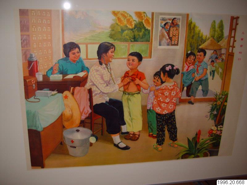 Affischen heter: Barnens allmänna undersökningsdag ( Ertong pu jianri ). Bilden visar två kvinnliga barfotadoktorer där den ena med stetoskop undersöker hjärtat på en pojke, medan den andra för anteckningar. Två flickor väntar på undersökning och flera barn skyndar till utifrån. Lokalen är uppenbarligen en sjukstuga. POL