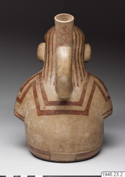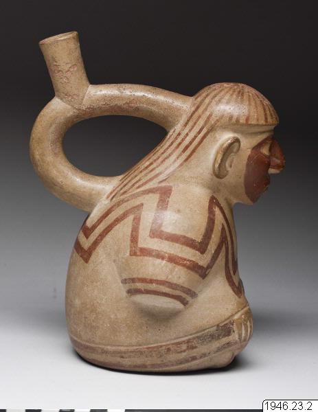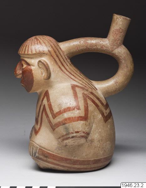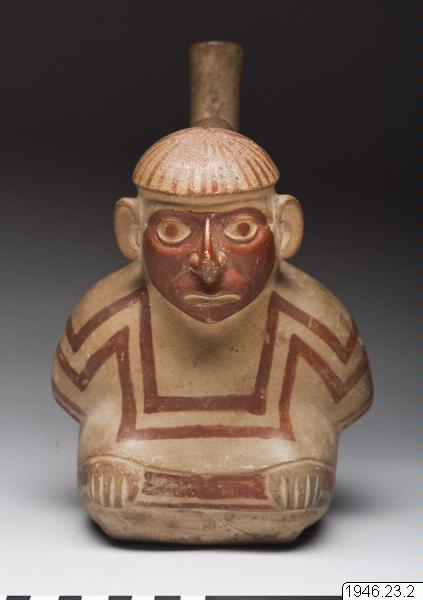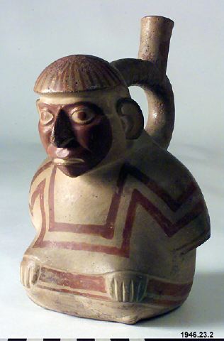 Sittande man, benen korsade, händerna vila på knäna. Han är iförd en skjorta och huvudkläde med på ryggen nedhängande dok. Bygeln med mynningsröret går från nacken till ryggens övre del. Hela ansiktet bemålat samt ganska fårat. Målningen rödbrun på gul botten. Ett gott och typiskt figurkärl från Chicama. Original nr 1497. Generalkatalogen./Is