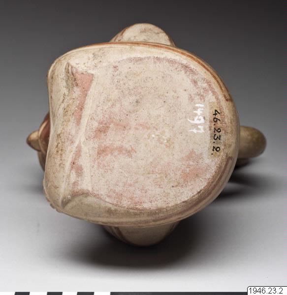 A stirrup spout vessel depicting a sitting man, legs crossed with his hands resting on his knees. He is wearing a tunic and headgear with a neckshield. This is a typical depiction of a warrior. The ha...