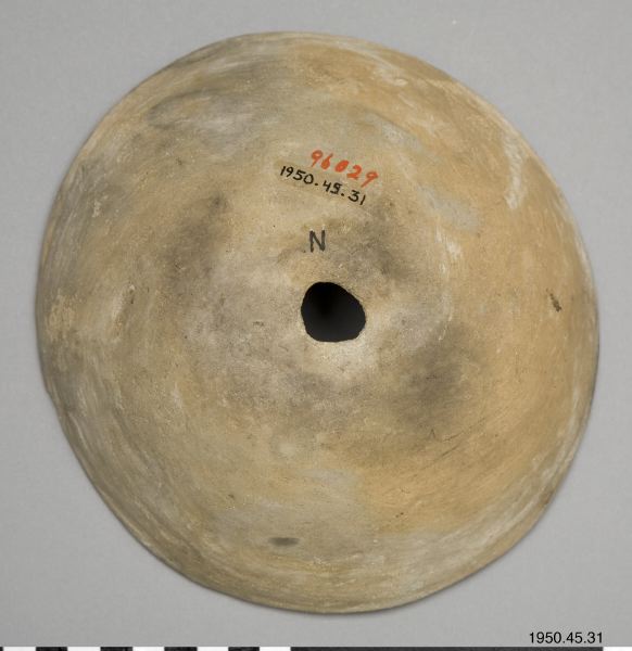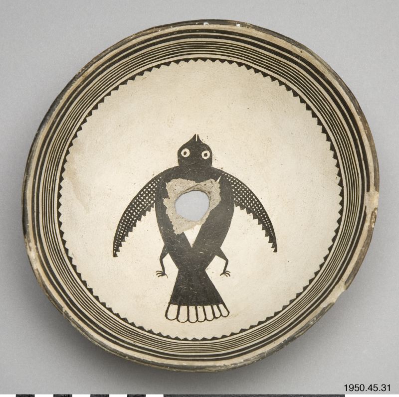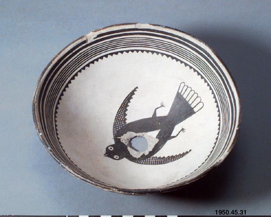 Klassiskt mimbre "black-on-white" kärl. Rundad botten och vid mynning, Dekorerat med parallella linjer på insidan vid mynningen. I botten en fågel med utspärrade vingar, ett sekundärt hål, ca 2 cm i diameter, i botten av kärlet. Funnen i en typisk Mimbre-ruin tre mil söder om den svarta ruinen? (the Swarts Ruin). Skålen placerades upp och ner över skallen i en barngrav. Notera hur man avbildat ögon och näbb på fågeln.