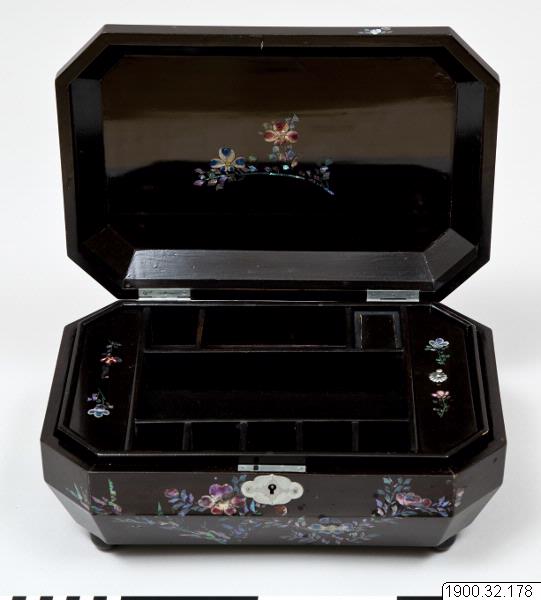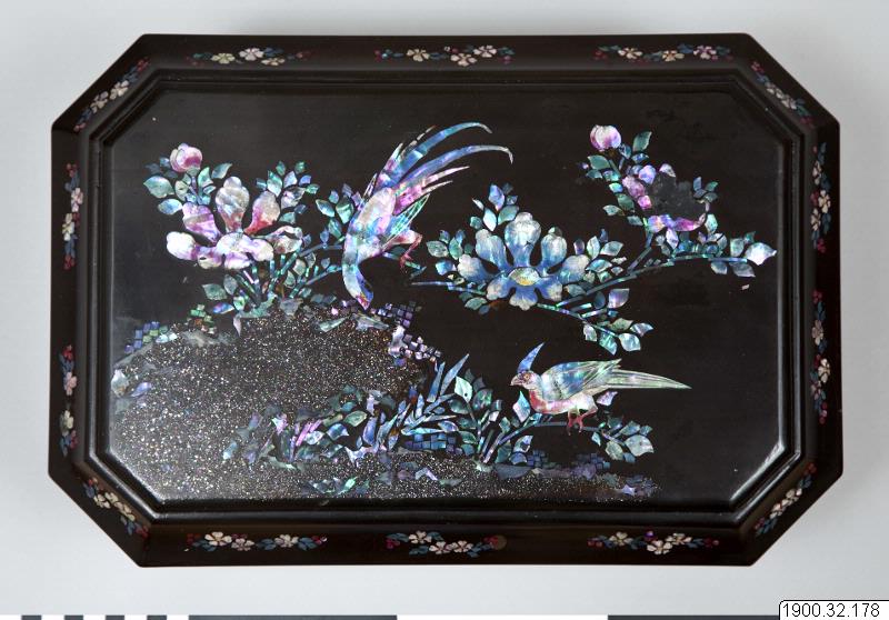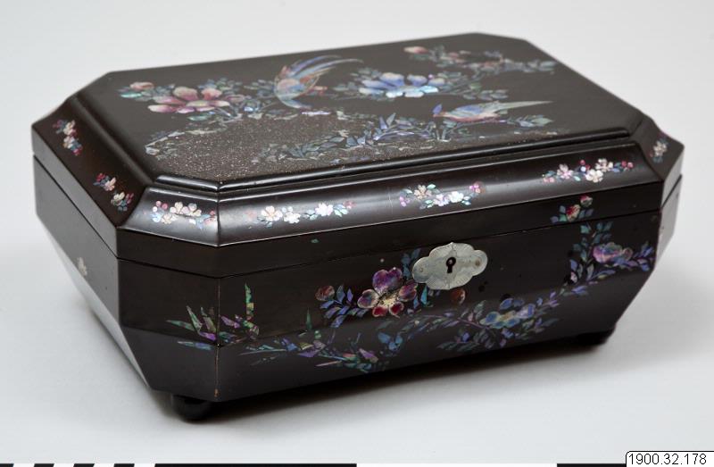 Skrin med lådor. Pärlemorinläggingar och svart lack, motiv av fåglar och blommor. Skrinet är troligen avsett för export till Västerlandet.