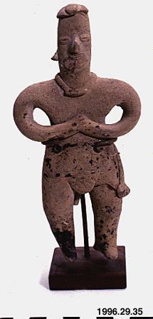 Figur i bränd lera. Förkolumbiansk stil. Föreställer man med händerna knutna på bröstet. Det tycks saknas delar av håret / huvudbonaden. Klädd i höftskynke, med ett verktyg fäst på högra höften, och ett halsband. Det finns spår av mörk glasyr eller färg. Figuren har vid okänt tillfälle innan inkomst till museet monterats på ett stativ med arm av mässing och fot av trä. Figuren hänger således fastklämd mellan mässingtrådar.