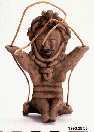 Figur i lera föreställande en person i gunga. Enligt uppgift en man, men möjligen kvinna. Lädersnören trädda genom hål i ”gungan” och skulpturens ”händer”. Svart färg på figurens läppar och huvudbonad. Liksom (andra) föremål i samlingen, äkthet ej bekräftad. Detta föremål ändå intressant ty det är ett exempel på hur man kan omvandla den förkolumbiska föremål till till vår tids "prydnadsföremål f...