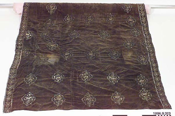 • Textil av grön sammet, broderad med silke och metalltråd. Kanterna och broderierna är fodrade, förstärkta på baksidan med vitt bomullstyg i tuskaft.