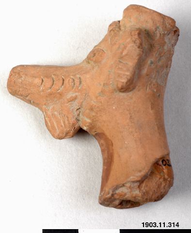 "Spouts. All Yotkan collection being of the character of purchased, detached finds, it follows as a natura consequence that as regards many of the preserved decorative details we are ignorant of their employment as well as of the type of vessel to which they once belonged. No change can be expected in this state of things until excavations have been carried out under scientific direction. In the majority of the works that have been published on this locality references are found of animal heads, which are hollow so as to form tubes through which it is possible to pour liquids. There can be no doubt that these objects served as spouts, but as to the shape, etc., of the respective clay vessels we are only able to advance theories. Even among this group of objects different types are distinguishable. The most common of these is the head of some animal or other, with elongated jaws - often with a tube inserted - set on a neck, cf. Fig. 16 b (1903.11.315). The spout as a whole is, as usual, moulded in two halves, but so as to leave a tubular cavity running along the middle. Fig. 16 c. (1903.11.313) shows an interesting example of this type of object, as here is preserved not only the whole of the spout but also a fragment of the pierced wall of the vessel, which proves incontestably that the object served some practical purpose. The head is provided with a large open mouth with formidable fangs, as well as the horn-like, offset-built projection mentioned in connection with the griffins already described. Fig. 16 b belongs to the same type, which is also represented in Grenard's work. (pl. VII). The bird´s head, Pl. XIV,1 (1903.11.316) probably also belongs to this class of objects as the beak forms a tube set at right angles to the hollow neck. Another variant is found in the he-goat's (?) head. Fig. 16 a (1903.11.314), which is open at the top as well. (Cf. Hoernle 1902, pl. XIII, 5. Cf. Crosby, p. 140.) The idea of this arrangement is difficult to explain, but it may not be altogether inconceivable that this spout once belonged to some kind of trick-jug. Vessels of that class are known to have existed in ancient times in China." "Fig. 17 b. (1903.11.243) illustrates a small and gently curving spout tapering towards its mouth, which might have belonged to a tea-pot of ordinary, modern Chinese type. At its lower end is a small appliqué lion mask. (Cf. Stein 1928, vol III, pl. I (Yo. 017)." Montell 1936, pp 175 ff./Is
