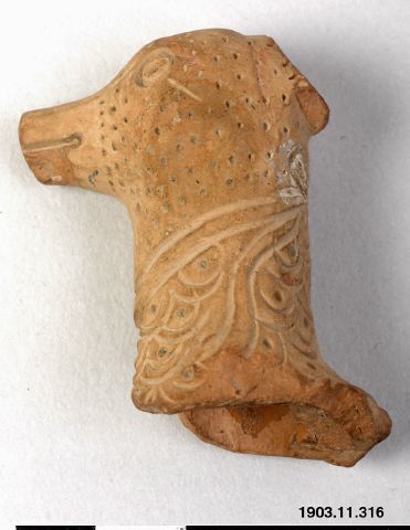 "Spouts. All Yotkan collection being of the character of purchased, detached finds, it follows as a natura consequence that as regards many of the preserved decorative details we are ignorant of their employment as well as of the type of vessel to which they once belonged. No change can be expected in this state of things until excavations have been carried out under scientific direction. In the majority of the works that have been published on this locality references are found of animal heads, which are hollow so as to form tubes through which it is possible to pour liquids. There can be no doubt that these objects served as spouts, but as to the shape, etc., of the respective clay vessels we are only able to advance theories. Even among this group of objects different types are distinguishable. The most common of these is the head of some animal or other, with elongated jaws - often with a tube inserted - set on a neck, cf. Fig. 16 b (1903.11.315). The spout as a whole is, as usual, moulded in two halves, but so as to leave a tubular cavity running along the middle. Fig. 16 c. (1903.11.313) shows an interesting example of this type of object, as here is preserved not only the whole of the spout but also a fragment of the pierced wall of the vessel, which proves incontestably that the object served some practical purpose. The head is provided with a large open mouth with formidable fangs, as well as the horn-like, offset-built projection mentioned in connection with the griffins already described. Fig. 16 b belongs to the same type, which is also represented in Grenard's work. (pl. VII). The bird´s head, Pl. XIV,1 (1903.11.316) probably also belongs to this class of objects as the beak forms a tube set at right angles to the hollow neck. Another variant is found in the he-goat's (?) head. Fig. 16 a (1903.11.314), which is open at the top as well. (Cf. Hoernle 1902, pl. XIII, 5. Cf. Crosby, p. 140.) The idea of this arrangement is difficult to explain, but it may not be altogether inconceivable that this spout once belonged to some kind of trick-jug. Vessels of that class are known to have existed in ancient times in China." "Fig. 17 b. (1903.11.243) illustrates a small and gently curving spout tapering towards its mouth, which might have belonged to a tea-pot of ordinary, modern Chinese type. At its lower end is a small appliqué lion mask. (Cf. Stein 1928, vol III, pl. I (Yo. 017)." Montell 1936, pp 175 ff./Is