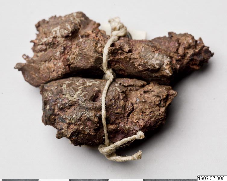 Två klumpar kopparmalm från första smältningen hopsatta med ett snöre. De respektive måtten är 5,5x2,5 cm samt 4x2,5 cm.