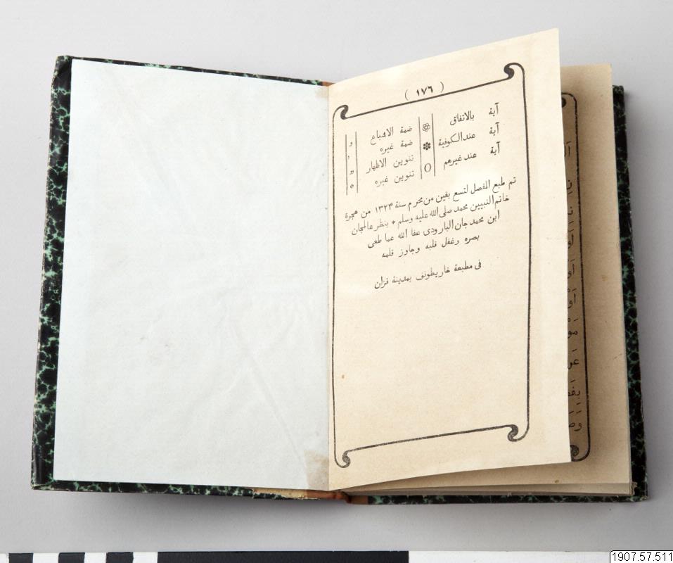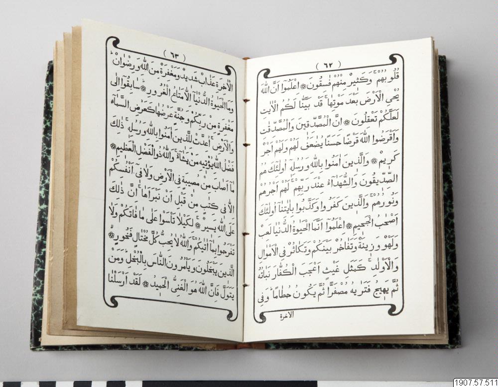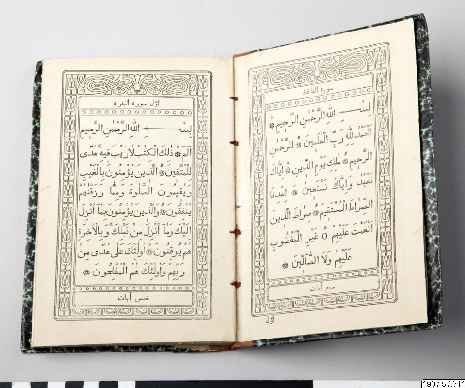 This book contains the first, of the thirty sections, of the Quran (Koran). Islam’s holy scriptures, the Quran, consists of 114 chapters (sura), but it is also divided into thirty nearly equal-sized sections called juz. The edition that you see, in the display case, shows the entire first, short opening chapter, the Al-Fatiha (The Opening) that is recited during each Muslim time of prayer.