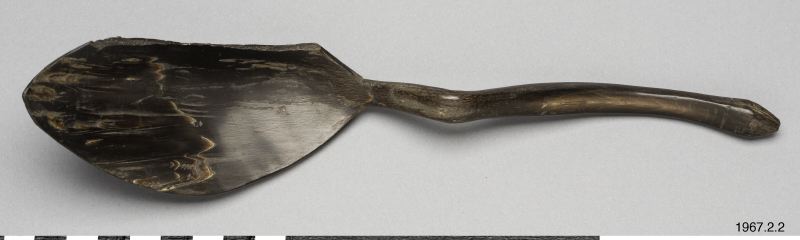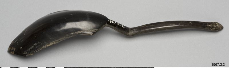 Sked av buffelhorn. Bladet skadat. Hornsnideri var en vanlig färdighet bland indianerna på prärien. Det böjda handtag som man finner på många hornskedar åstadkoms genom att man kokade hornet i vatten tills det mjuknade varvid det sedan kunde böjas till önskad form./ASH, SB Ibland har hornskedar dekorerade fågelhuvuden: sioux-"mode" på 1870-talet. Se t.ex. Colin Taylor, sid 51 för bild på typiska hornskedar från sioux.